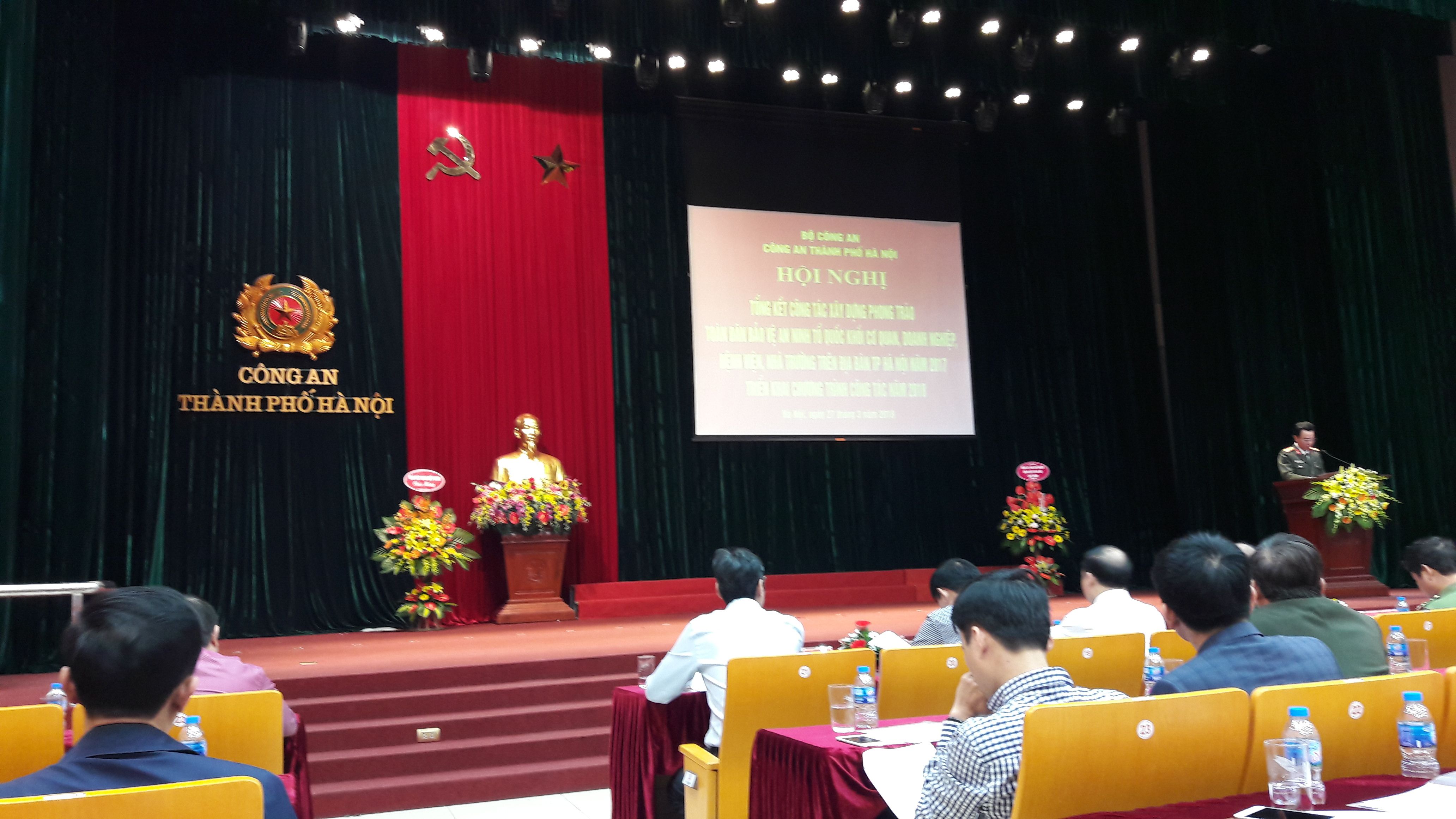 Nhằm tổng kết đánh giá và nhân rộng các điển hình trong phong trào toàn dân bảo vệ an ninh Tổ quốc trên địa bàn thành phố Hà Nội. Sáng ngày 27/3/2018, tại Hội trường Công an thành phố Hà Nội số 83-85 Trần Hưng Đạo, Hoàn Kiếm, Hà Nội, Công an Thành phố Hà Nội tổ chức Hội nghị tổng kết công tác xây dựng phong trào toàn dân bảo vệ ANTQ khối cơ quan, doanh nghiệp, bệnh viện, nhà trường trên địa bàn TP. Hà Nội năm 2017 và triển khai chương trình công tác năm 2018.